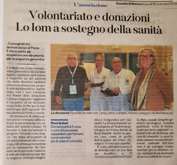 Pubblichiamo l’articolo della Gazzetta di Mantova riguardante la donazione da parte dello IOM di 3 dermatoscopi al reparto di dermartologia dell’Ospedale Poma di Mantova. Gli strumenti ser