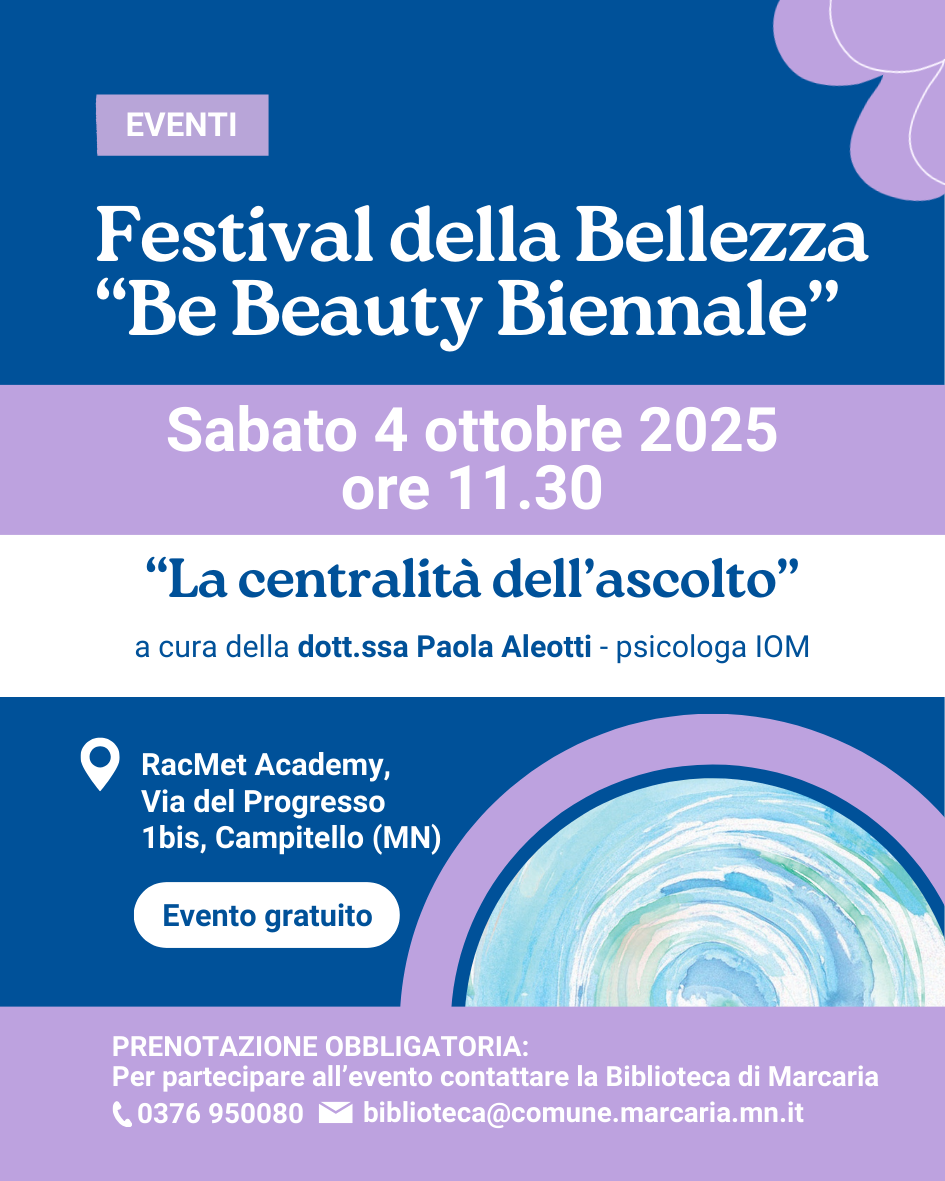 Sabato 4 ottobre alle ore 11.30, IOM parteciperà con un intervento speciale al Festival della Bellezza – Be Beauty Biennale, la manifestazione organizzata dal Comune di Marcaria che unisce cultura,
